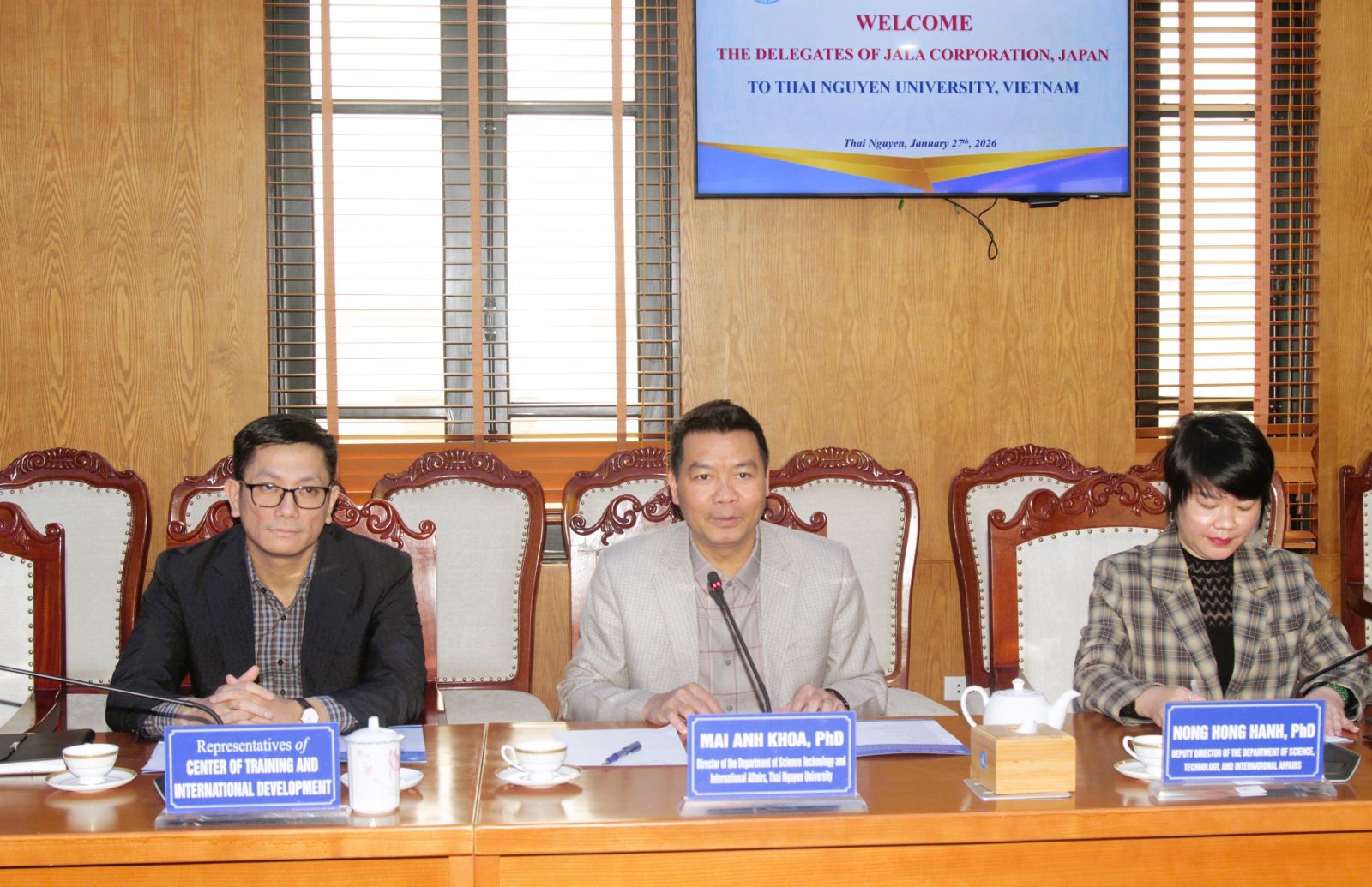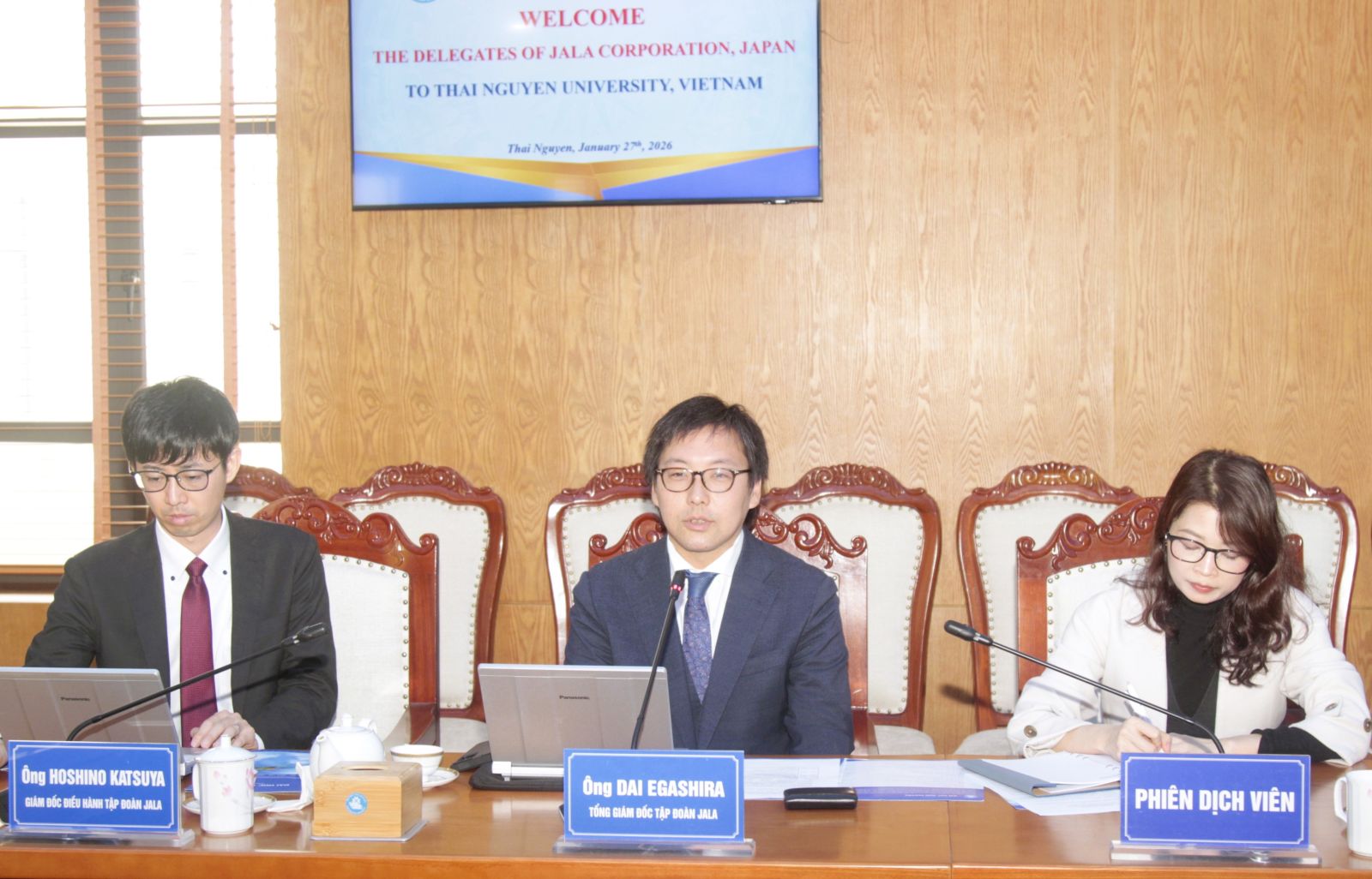 Chiều ngày 27/1, Đại học Thái Nguyên (ĐHTN) đã tiếp và làm việc với Đoàn công tác của Tập đoàn JALA, Nhật Bản. Tham gia Đoàn công tác có ông Dai Egashira, Tổng Giám đốc Tập đoàn JALA; ông Hoshino Katsuya, Giám đốc Điều hành Tập đoàn JALA; cùng đại diện Công ty TNHH WSY Việt Nam.